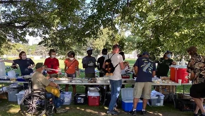 Serving a community meal every Monday night 4-7 PM at 14th and Bannock St, Denver. During this community meal, we can serve up to 400 neighbors. We also distribute heaters, insulation for tents, blankets, sleeping bags, clothing, hand warmers, toiletries, and more.